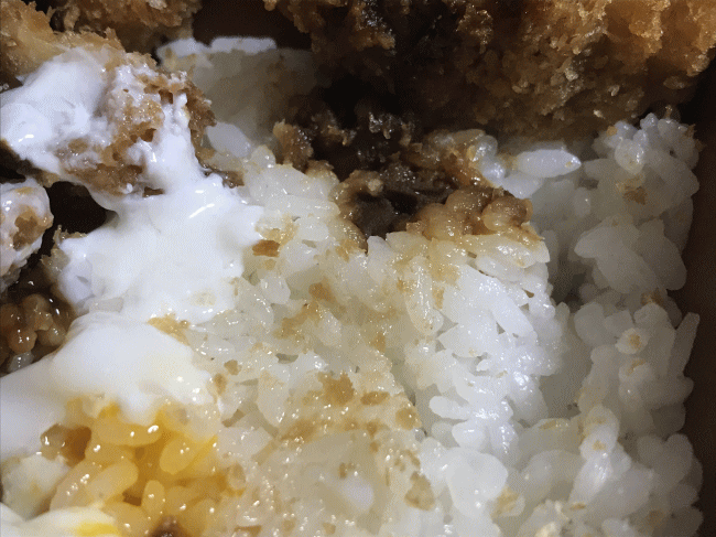 ご飯です。愛知県や三重県の駅弁は白飯が美味しくないことが多い中、今回はちょうど良い炊き加減でした。味噌だれや半熟玉子も適度に染み込んで、これだけでも茶わんに一膳は頂けてしまいますね。