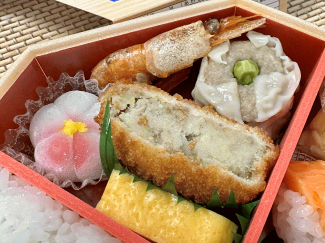 八角形を四つに区切ったお弁当箱の二つは、おかずコーナー。粟島産のジャガイモを使った分厚いコロッケが素晴らしいです。甘さ控えめで素材の味が生きてますね。それは厚焼き玉子も同様です。焼売や黒酢ミートボールは新潟と直接の関係は無さそうですけど、単体としてなかなか。日本海で採れる南蛮海老の素揚げも最高で、頭から全て頂けます。