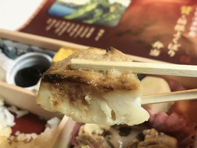最後、山麓豚の下側に更に視線を移すと、カレイの西京焼きが入っていました。駅弁にカレイはなかなか珍しく、他にはすぐに思い浮かびません。