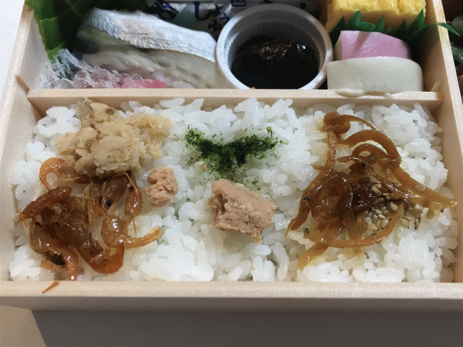 今回は、最初にご飯の部分から。白飯に、白魚や川海老の甘露煮のほか、鮭や金目鯛のそぼろが乗っています。品数を多くする工夫がみられますね。飽きの来ないお弁当に仕上がっています。