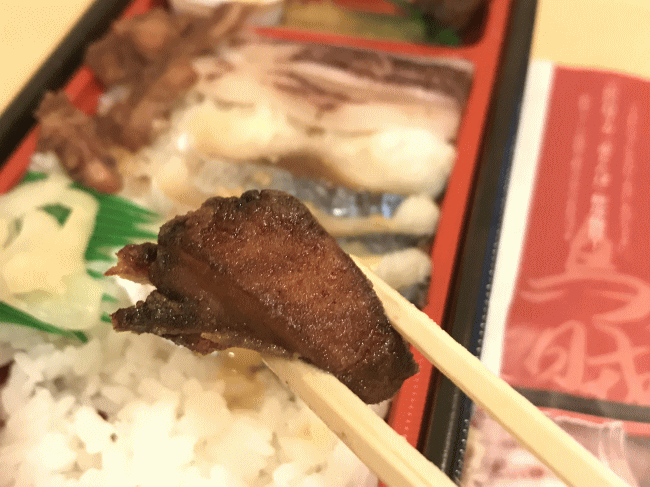 動画でパクっと食べた残りなので、小さい状態で写っております。これが濃厚な醤油の旨みによって、メリハリの利いた味わいに変化しています。そもそも、鯖の竜田揚げなどは家庭で食べる事もほとんど無いと思いますし、駅弁としても皆無だと思うので、感心しながら食べた次第です。