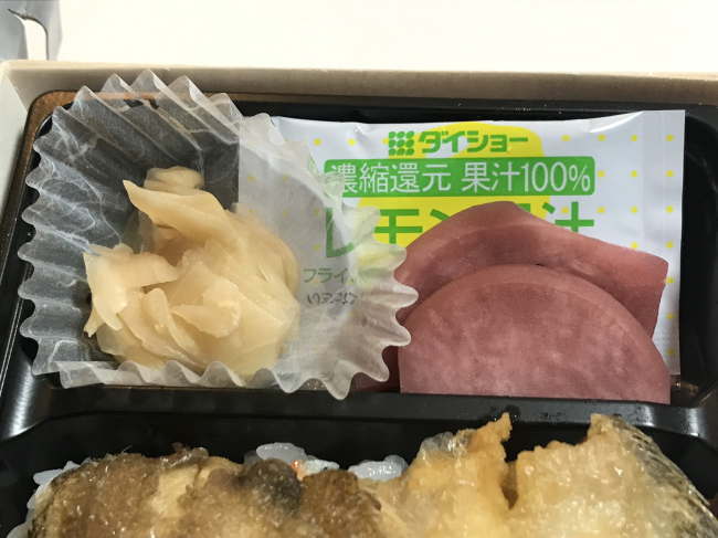 添えられている漬物や生姜も写しておきます。「ありきたりな駅弁業者」だと、ここに安直に煮物などを置いたりするものですが、素揚げの様なやや油っぽい食品には、これが一番です。しかも素揚げにはレモン汁をかける事もできますので、思ったよりもさっぱりとした食後の感覚となります。