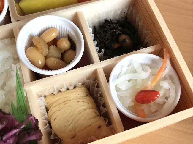 開封した状態で左上の4区画を見ます。小松菜の煮びたし、出汁巻き玉子、人参のきんぴら、高野豆腐です。若葉色のお麩を添えていたりして、色合いとしても美しいです。