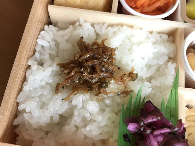 ご飯も、京都風の食べ方で、ちりめんじゃこですね。柴漬けを添えて。ご飯が瑞々しくて、お料理の全てを完璧に引き立てていました。こうやってみてくると、淡路屋の駅弁よりも、明確に美味しそうだなと感じますでしょ・笑。