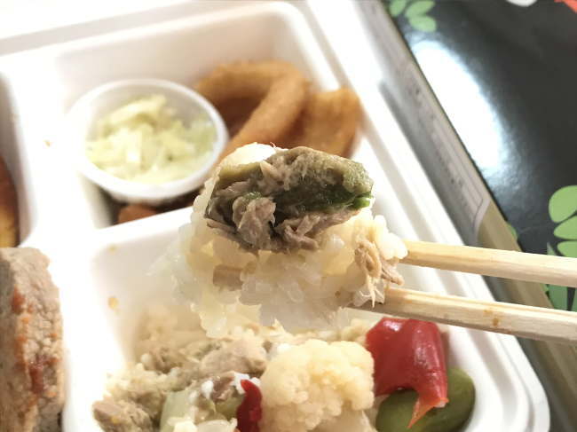 そして、オムレツの下にはパイナップルまでありました。それらがご飯の上に乗っかっており、まさにこれはロコモコです。以前、宇都宮駅の駅弁にHIMITSUのロコモコなるハワイアン駅弁が存在しましたが、それ以来の、駅弁としてのハワイ料理です。