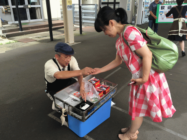 「ホームでは有名な駅弁を販売しております」と車内放送が有ったので、駅弁の立ち売りかと思って気合入れていたら、こんな感じでポツリとホームに座ってらっしゃって、確かに有名な鱈めしとスル天が売られていました・・・。