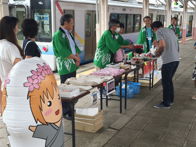 二本木駅では現地の特産品などを売っていましたが、無料で何かもらう事が出来ないと、人は群がりません・苦笑。翌々日に乗車したしなの鉄道のろくもんでは、ちゃんと無料で差し上げるものがあって、その見返りに思わず饅頭を買ってしまいましたからね・・・。