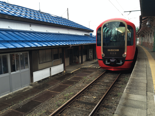 明治時代の駅舎に隣接して停車する、最新鋭の雪月花。20分間停車します。