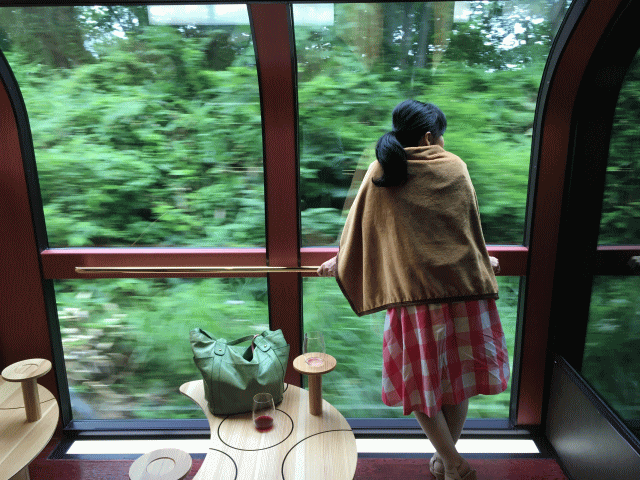 雪月花は日本で最も展望に優れた車両なので、展望デッキから眺める車窓風景が、とにかく魅力的でした。こんなにも緑色に包まれた時間は、都会人には贅沢すぎます。このような贅沢な空間で、気の置けない人と語り合う時間こそ、雪月花の最高の魅力ですね