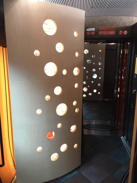 車内に入って、車端部の連結部分。まるで美術館にいるかのような美しさです。