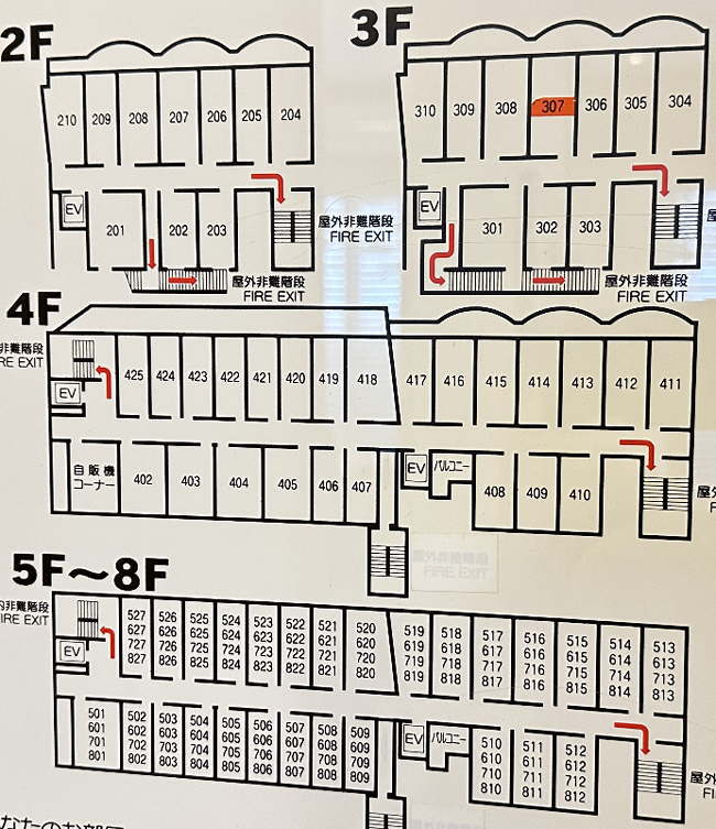 その後、2023年3月に、当サイト管理人も駅前フジグランドホテルに宿泊しました。その時に、ホテルの客室案内図を撮影しましたので、ご確認ください。5階以上の部屋で、図に向かって左上側の客室が、トレインビューとして最適です。右上側だと少し遠くなります。