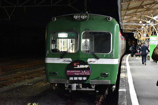 夜景電車は毎週ではありませんが、土曜日に2便運行されます。臨時列車ではなく、定期列車2連の後部車両の車内照明を消し、それが「夜景電車」となります。