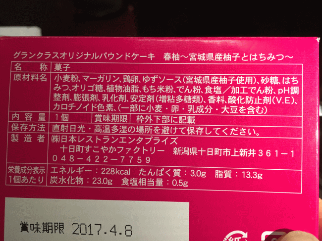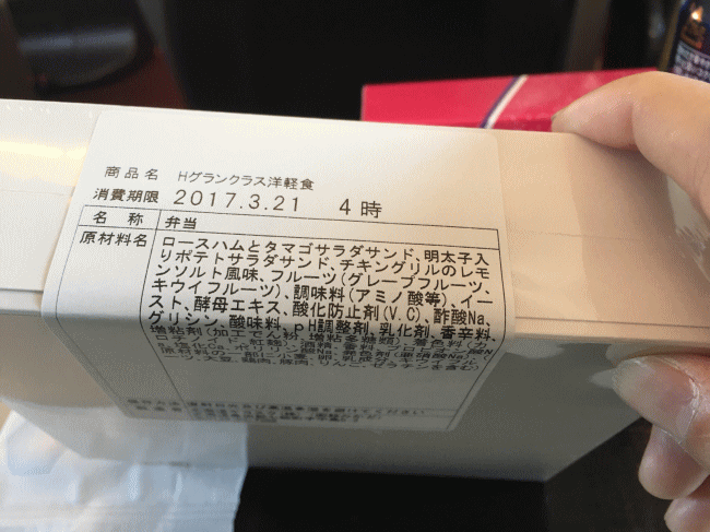 (グランクラス洋軽食のラベル表示。こんな色々と添加物が入っているのに、持ち帰りは禁止となっています。)