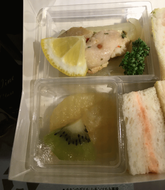 まずは、グランクラス洋軽食から。できれば和軽食にしようかと思いましたが、この日までに北海道で和の駅弁を食いまくってきたため、いい加減、洋食を食べたいとの欲求が強く、今回は見た目も中身もイマイチ地方色を感じられないようなサンドイッチになりました。