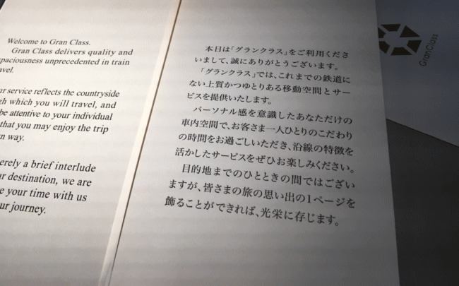 (開いてみると、グランクラスのコンセプトの説明などが書いてありました。)