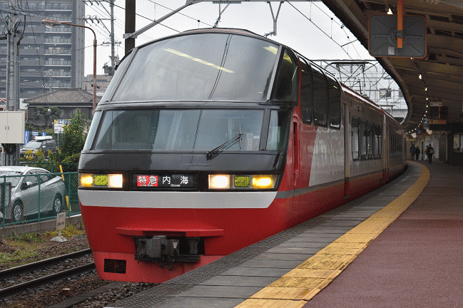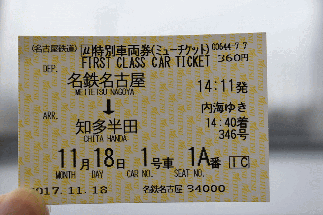 今回は名鉄電車を利用しました。土休日は内海行と河和行各1時間に1本の特急が、「一部特別車」の編成で運行されており、乗車直前ながら展望席をゲットすることができました。自動券売機で展望席を選択することができ、非常にお手軽に購入することができます。