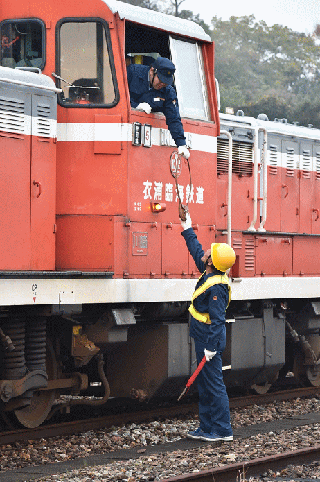 衣浦臨海鉄道の閉塞方式は半田線、衣浦線とも、全国的に貴重な存在となったタブレット式です。何と!素晴らしいことに、タブレット受け渡しシーンの撮影タイムも設けられました。ここでは日常の光景ですが、その価値に気が付いている衣浦臨海鉄道様、まさに「神対応」の域に達しています。(2017.11.18 16:12)