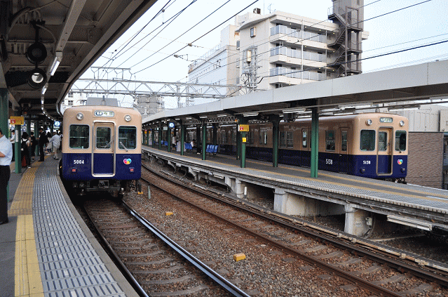大石駅の梅田方面行ホームの先端から撮影。障害物が多くなかなか難しいです。電車はニュージェットカーとも呼ばれる5500系です。(2016.8.11 17:01)