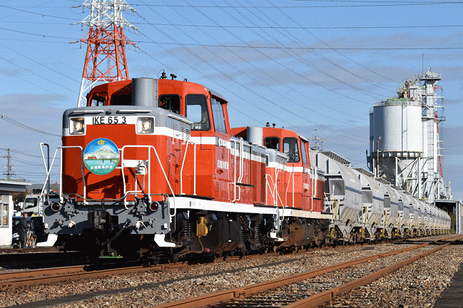 社員さんの手造りというヘッドマークを掲出した白ホキ重連が通過します。普段はヘッドマークは付いていませんが、本日は今年10月に鉄道の日記念で運行したヘッドマーク付き列車の「アンコール」とのことで、昨日と本日に限り掲出されました。