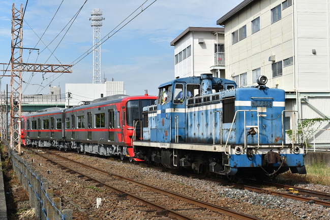 名鉄築港線とのダイヤモンドクロスを通過して、名電築港(信)に到着した甲種輸送列車です。(2020.9.21 9:24)