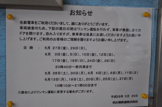 乗り換えた7:38発御嵩行は通常の6000系ワンマン仕様車ではなく、非ワンマンの6000系鉄仮面でした。駅の掲示を後で見ましたが、日中はワンマンのところ、日によって終日車掌乗務の場合があるそうです。