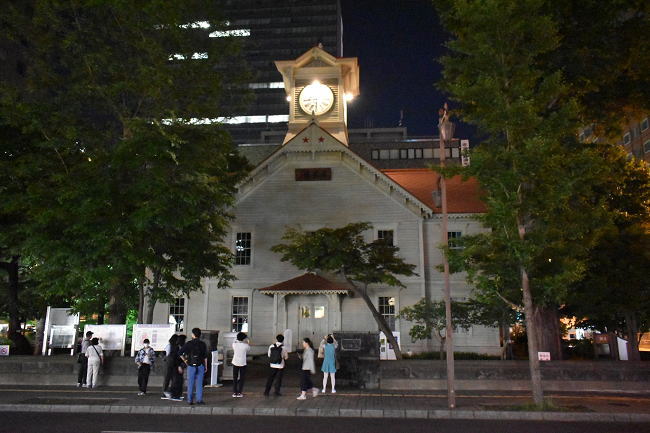 札幌駅から中央バスの札幌ターミナルまで歩きます。時計台には週末とあって遅い時間でも観光客の姿ありました。(2023.6.24 21:43)