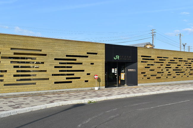 カラマツ集成材を用いた外装が特徴的な知床斜里駅。6:30から営業が始まるみどりの窓口の他、観光センターや売店もあります。