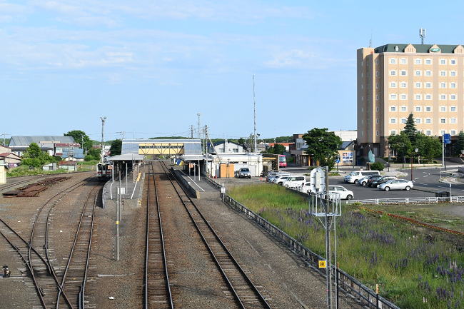 知床斜里駅東側より駅構内を眺めます。右側に見えるホテル「ルートイングランディア知床斜里駅前」はトレインビューが期待できそうなうえに、鉄活動の拠点としても便利そうです。(2023.6.25 6:18)