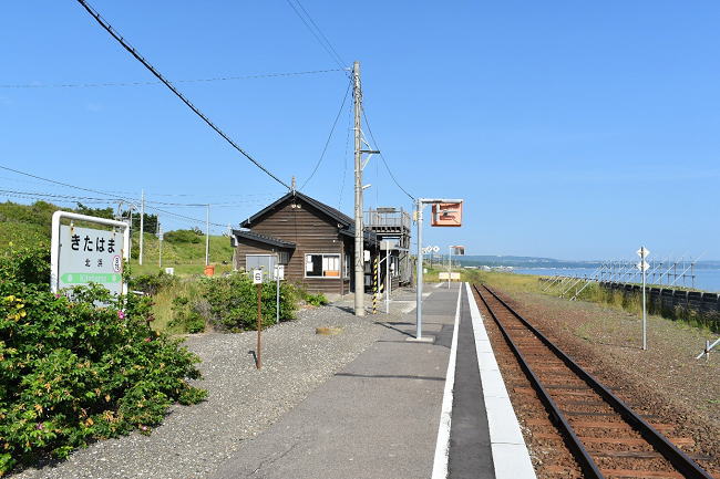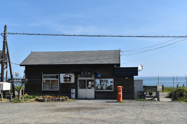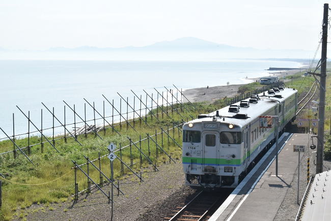 北浜駅の展望台より、先ほど降りた列車を後追いで撮影することができました。去り行く列車とオホーツク海の風景は一幅の絵のようで、釧網本線の魅力をあらためて実感したのでした。(2023.6.25 7:15)