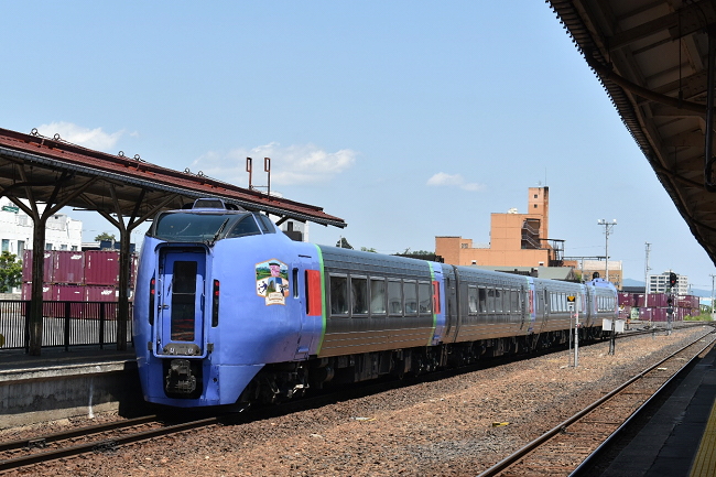 久々の市街地である人口11万人の北見で遠軽行は11:23から11:37まで14分間の停車、一般のお客さんの大半が下車し車内は閑散となりました。ここで交換した11:24発特急「オホーツク1号」網走行は4連の増結編成でした。(2023.6.25 11:24)