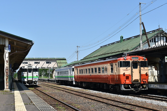 終点の遠軽には12:52に到着。前述のように車両はそのまま13:27発の旭川行となるものの、車内に留まることはできません。乗務員の都合と清掃等によるものだそうですが、厳寒期にはなかなか厳しいものがあります。なお右側の列車は13:00発の網走行で、どちらも豪華2両編成で、旭川へ(から)の回送を兼ねていると推測されますが、長時間キハ40の旅を楽しむことができるとあって、乗り鉄には非常に嬉しい列車です。(2023.6.25 12:53)