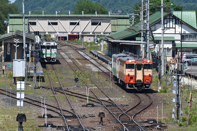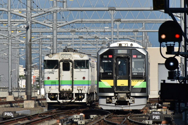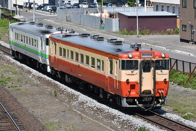 回送列車として運転所へ入庫するキハ40と、発車したH100による富良野線列車を後追いで撮影。最後に新旧車両の競演を見ることができました。キハ40の引退も遠くはなさそうで貴重なシーンとなることでしょう。(2023.6.25 17:18)