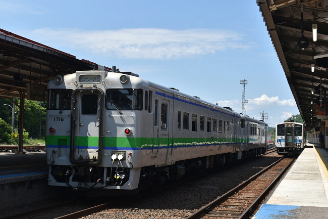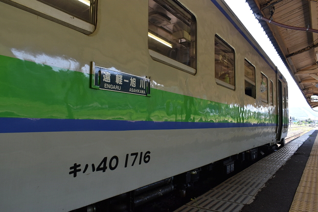 旭川行は引き続きキハ40-1716と1761の2連で運行、遠軽からは1716号が先頭となります。車内はさすがに無人のボックス席が半数近く、部活帰りと思しき高校生数人の他は私を含めて鉄分濃い目の旅行者ばかりです。