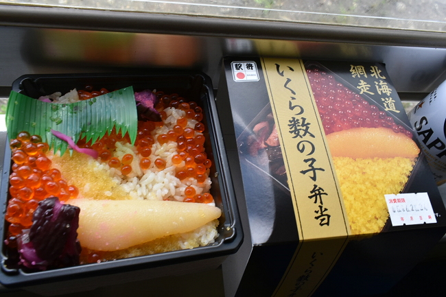 遠軽で入手したビールとともに、網走駅弁「いくら数の子弁当」で遅めの昼食です。ボックス席でビールとともにいただく駅弁は、もう極楽です。