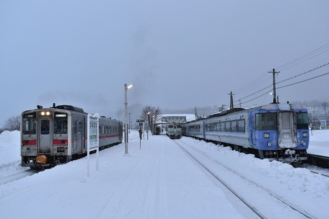 特急列車の到着を待って、北見行特別快速が先に発車しました。この時期の日没は16時頃で、すでに薄暗くなっていました。(2022.1.8 15:42)