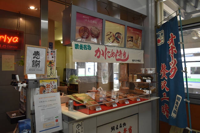 待合室内にあるモリヤ商店の売店で駅弁とビールを調達しました。お弁当は全種類揃っており、お客さんも途切れることのない盛況でした。駅前にコンビニがないため、食料調達には貴重な存在です。