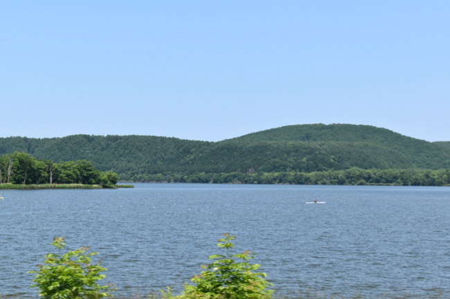 網走駅を出発してすぐ、右側車窓に網走湖が広がります。(2023.6.25 10:23)