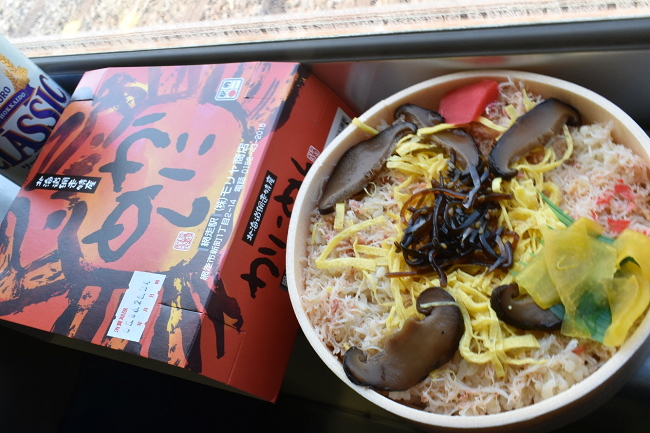 早速、「駅弁とビール」を実行。昼食には少し早いですが、網走駅で購入したかにめし(1,100円)をいただきます。昨今はボックスシートで実施する「駅弁とビール」は、なかなか得難い経験となってしまいました。