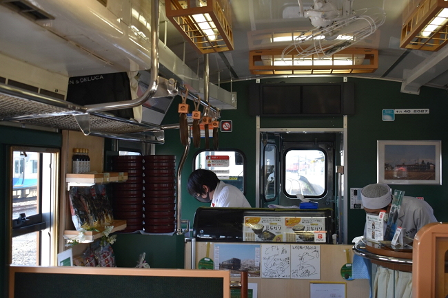 「べるもんた」=キハ40 2027の車内です。7番A席~13番B席が窓向きのカウンター席で、一人旅には最適です。観光列車のネット予約では座席位置の指定ができない中で、幸いにもカウンター席が指定されましたので、気兼ねなく車窓を堪能することができました。なお当日はほぼ満席といった印象でした。(降車時に撮影)