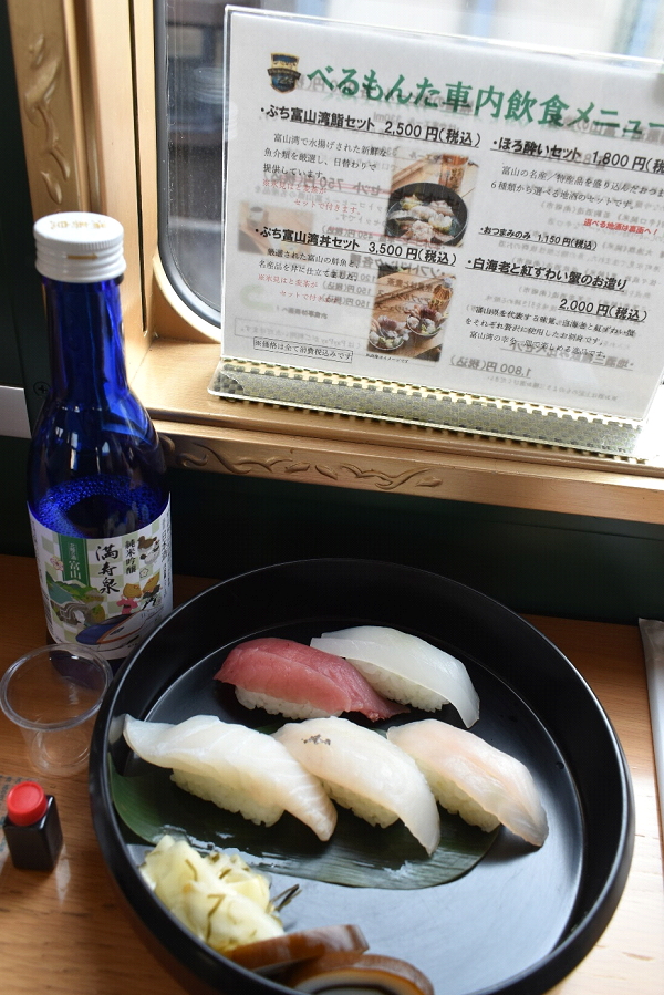 車内で握っていただいた「ぷち富山湾鮨と富山の逸品セット」(2500円)と、別途用意した満寿泉の純米吟醸という、ヒトをダメにする一式で旅を楽しみました。お鮨は新鮮かつ肉厚で極上の味で、回転する鮨しか日頃は口にしていない私にとって、その美味しさは衝撃的ですらありました。富山恐るべしです。ところでこちらは、事前にネット(VISIT富山県)で予約しましたが、食材に余裕があれば当日車内で注文も可だそうです。なお運行はJR、車内サービスは「城端・氷見線活性化推進協議会」が担っているようです。