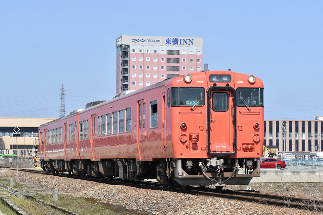 同じ場所で城端行「べるもんた53号」を撮影。位置関係からして、東横インの客室からのトレインビューは素晴らしいことでしょう。(2024.3.16 13:13)