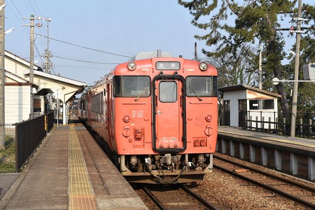 雨晴駅から南西の越中国分方面に約800m歩いた展望広場付近のお立ち台で活動を実施します。まずは529D列車氷見行を後追いで撮影。近くには「岩崎口」バス停があり、氷見と高岡を結ぶ路線のうち1時間に1本程度が発着しており、列車の少ない時間には重宝することでしょう。(2024.3.16 8:27)