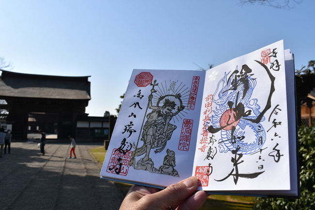 ご朱印は本尊の釈迦如来(右)と東司の守護神(トイレの神様)烏瑟沙摩明王(左)を拝受しました。手書き+スタンプのカラフルなご朱印です。