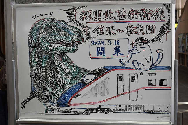 新高岡駅に戻り、いよいよ北陸新幹線で敦賀に向かいます。新高岡駅には絵心のある方がいらっしゃるようで、素晴らしいホワイトボードアートが金沢~敦賀間の開業初日を盛り上げます。