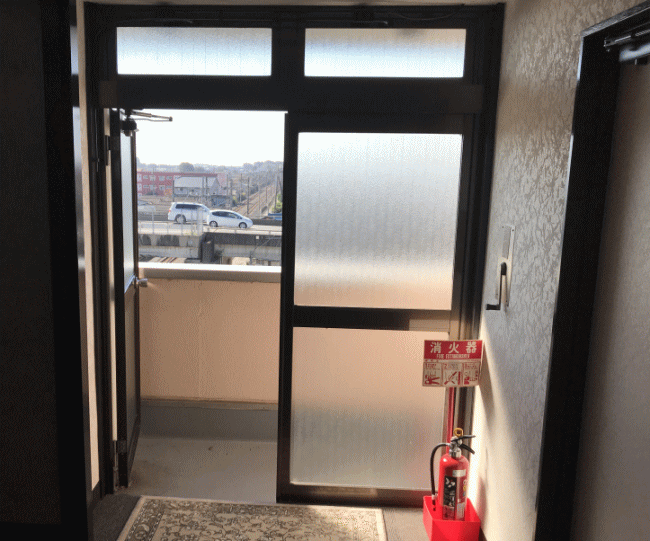 なお、あいにく線路側の部屋とは反対の部屋に泊まった場合でも、通路の端部の非常階段に通じるドアの部分から、このように眺める事ができます。この位置から、危険の無いように撮影するのも良いでしょう。