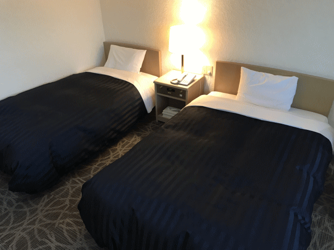 | 設備 | 下記は、ツインルームの様子。シングルもこれと似たような雰囲気です。昭和レトロな感じはしますが、実質的には東横インと同程度の設備になり、何の問題もありません。 |