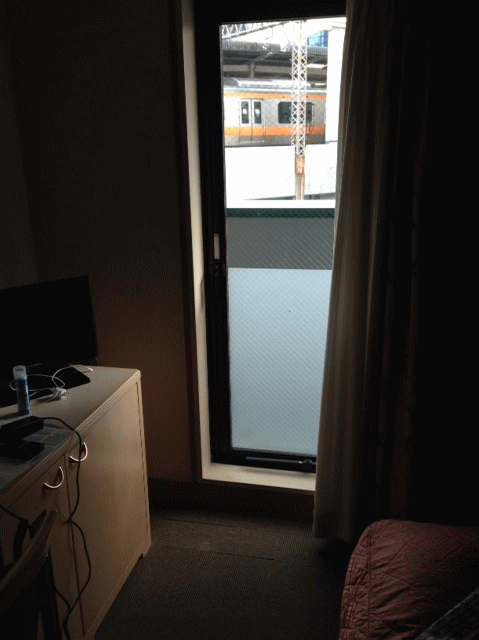 部屋と窓と鉄道の関係は、下記の写真。中央本線とめっちゃ近いので、カーテンを開けると上客やホームの人たちからホテル客室内が丸見え状態です。