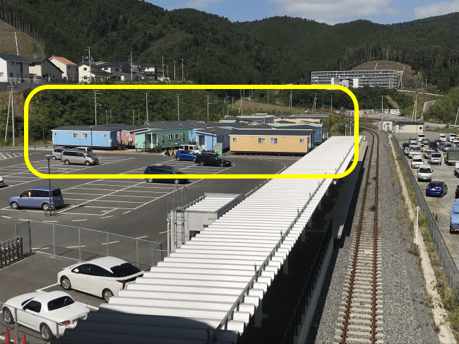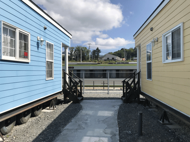 ホテル・エルファロ女川トレーラーハウス宿泊村は、まさに女川駅に「隣接」していると言っても過言ではない近さです。駅の駐車場の隣ですから、迷う事もありません。
