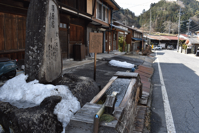 井戸からの水を引いた「水舟」が見られるのが、須原宿の特色です。