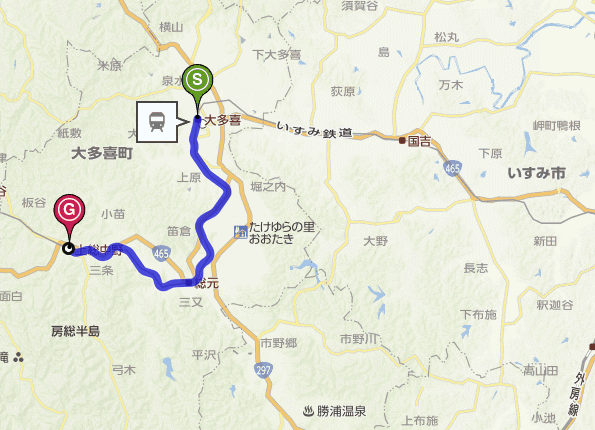 青い丸が祠で、今回は赤い枠のあたりから矢印の方向に撮影しました。写真上が、大多喜駅方面。